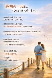 人生が動き出すことがあります。実際にご成婚された多くの方が、「もっと早く始めればよかった」と話されています。結婚相談所への入会は、少しハードルが高く感じるかもしれません。でも、特別なことではありません。仕事を探すのが「就活」なら、結婚相手を探すのは婚活」。どちらも、未来のための自然な行動です。今のままを続けるか、一歩踏み出すか。その選択で、これからは変わっていきます。