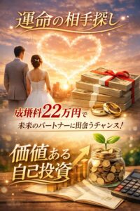 人生の中で大きなお買い物には、数十万〜数百万円の費用がかかることもあります。その中で、成婚料22万円で大切なパートナーと出会える可能性がある婚活は、将来を見据えた「価値ある自己投資」と考える方も多くいらっしゃいます。